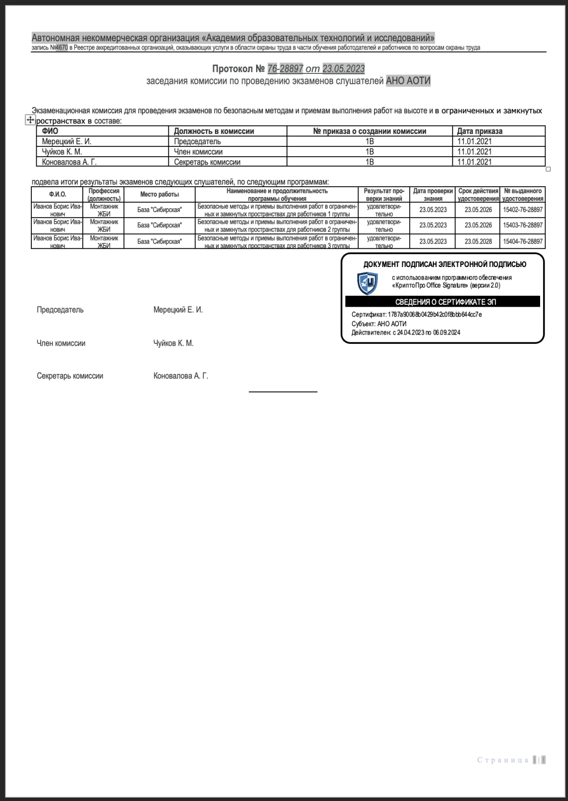 Протокол проверки знаний