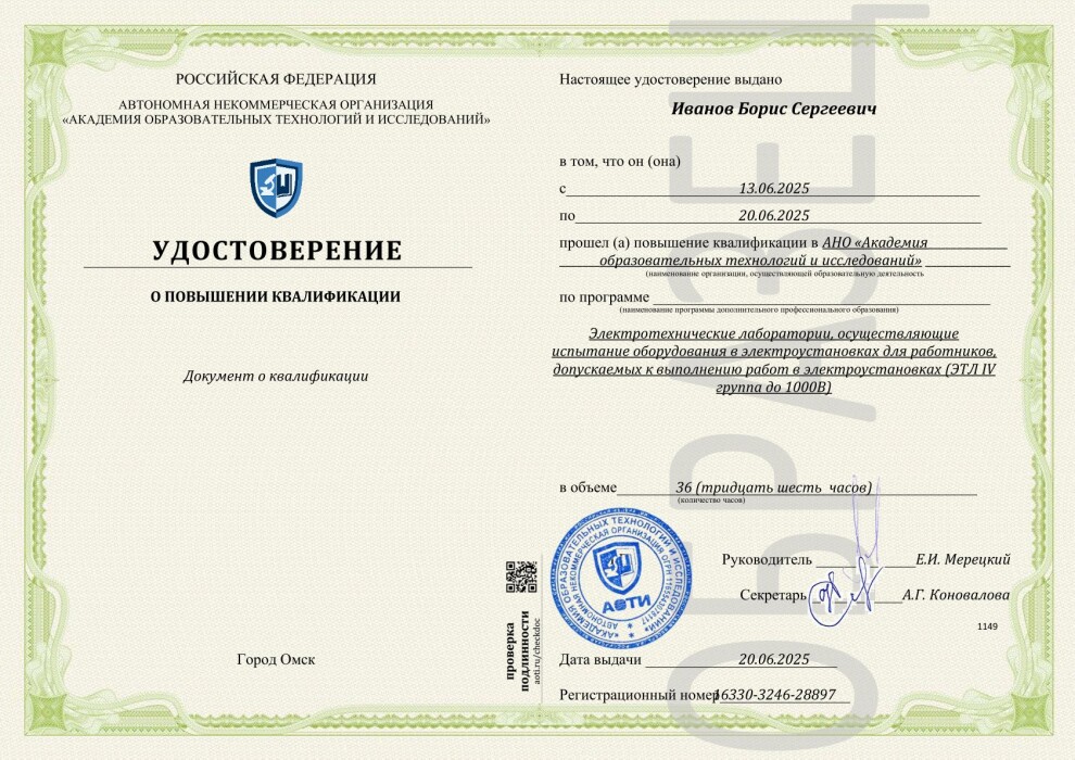 Электротехнические лаборатории, осуществляющие испытание оборудования в электроустановках для работников, допускаемых к выполнению работ в электроустановках (ЭТЛ IV группа до 1000В)