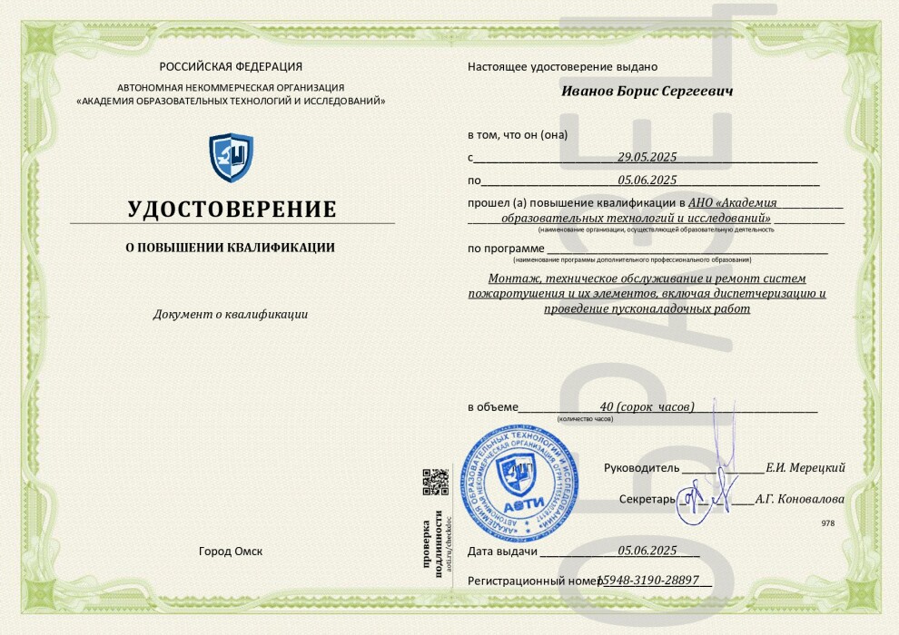 - специалистов, осуществляющих деятельность по монтажу, техническому обслуживанию и ремонту, в том числе диспетчеризацию и проведение пусконаладочных работ систем пожаротушения, пожарной сигнализации, оповещения и эвакуации при пожаре, в том числе фотолюминесцентных эвакуационных систем, дымоудаления и противодымной вентиляции, противопожарного водоснабжения, передачи извещений о пожаре, противопожарных занавесов и завес, заполнений проемов в противопожарных преградах, и их элементов, в том числе проведение огнезащитной обработки материалов, изделий и конструкций, а также первичных средств пожаротушения