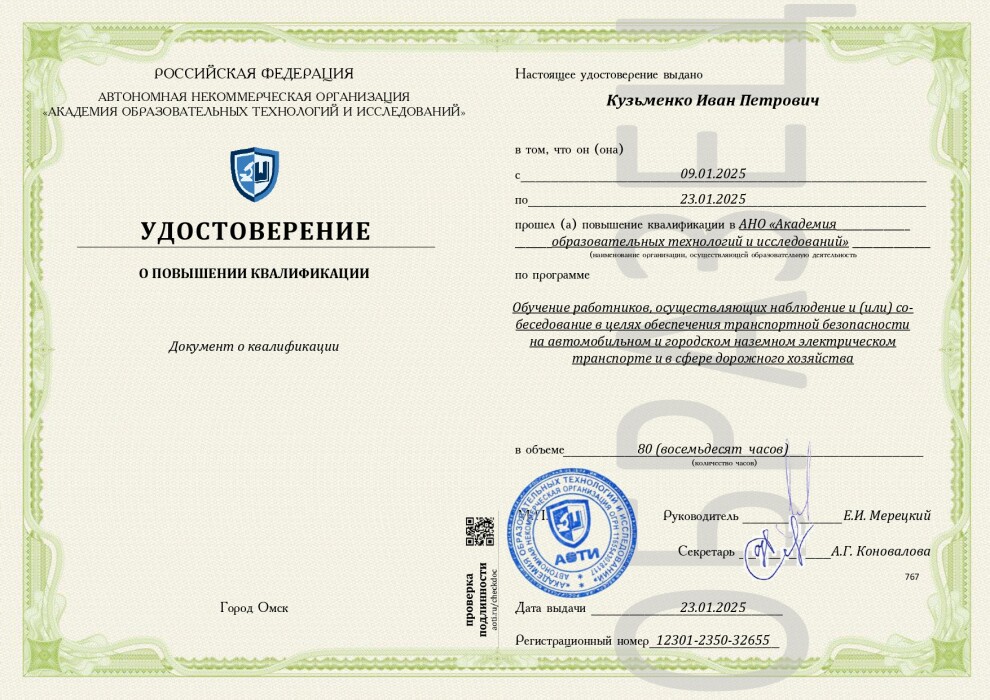 Обучение работников, осуществляющих наблюдение и (или) собеседование в целях обеспечения транспортной безопасности на автомобильном и городском наземном электрическом транспорте и в сфере дорожного хозяйства