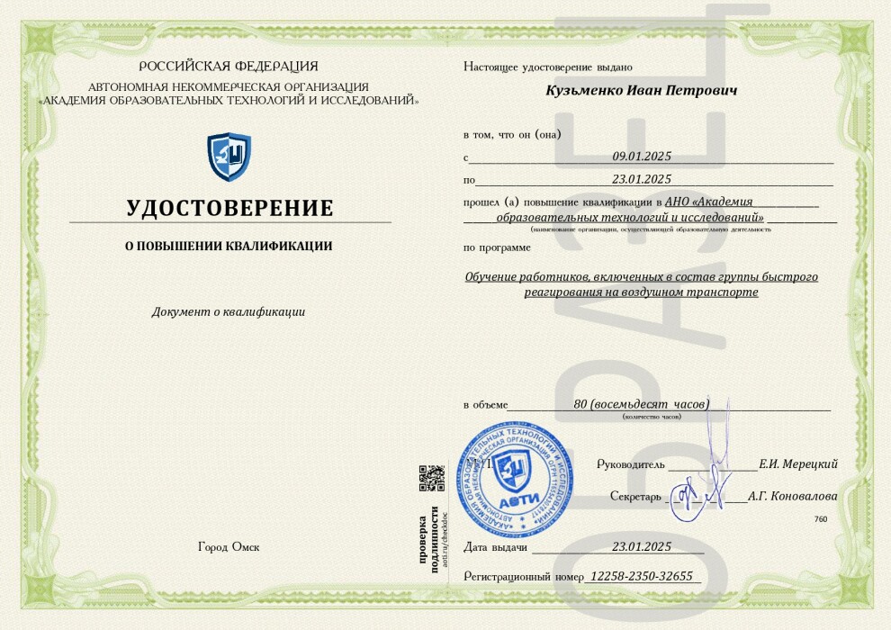 Обучение работников, включенных в состав группы быстрого реагирования на воздушном транспорте