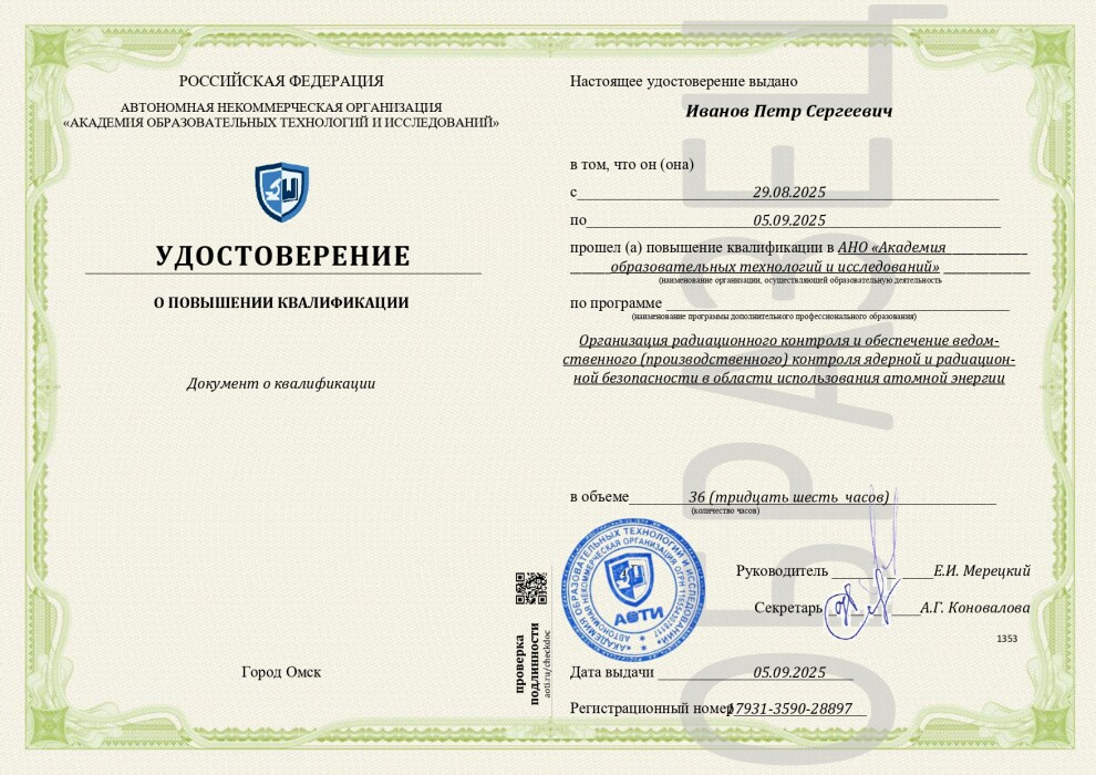 Организация радиационного контроля и обеспечение ведомственного (производственного) контроля ядерной и радиационной безопасности в области использования атомной энергии